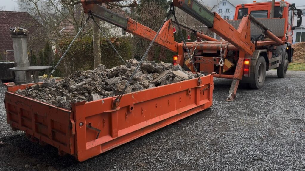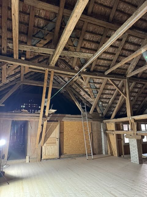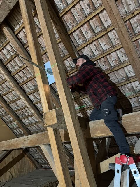 Dachbalken werden mit einem Drahtseil wieder gesichert